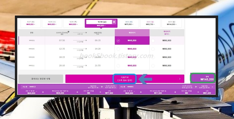 오늘은 해외출발 항공권을 저렴하게 예약하는 방법을 알려드렸는데요. 5단계에서 선택을 누르시면 비행기표 예약을 할 수 있는 사이트로 이동한답니다. 각 항공사나 여행사마다 세부사항은 다르지만, 기본정보를 입력하고 결제를 하는 큰 틀은 동일하기 때문에 간단히 진행하실 수 있습니다.