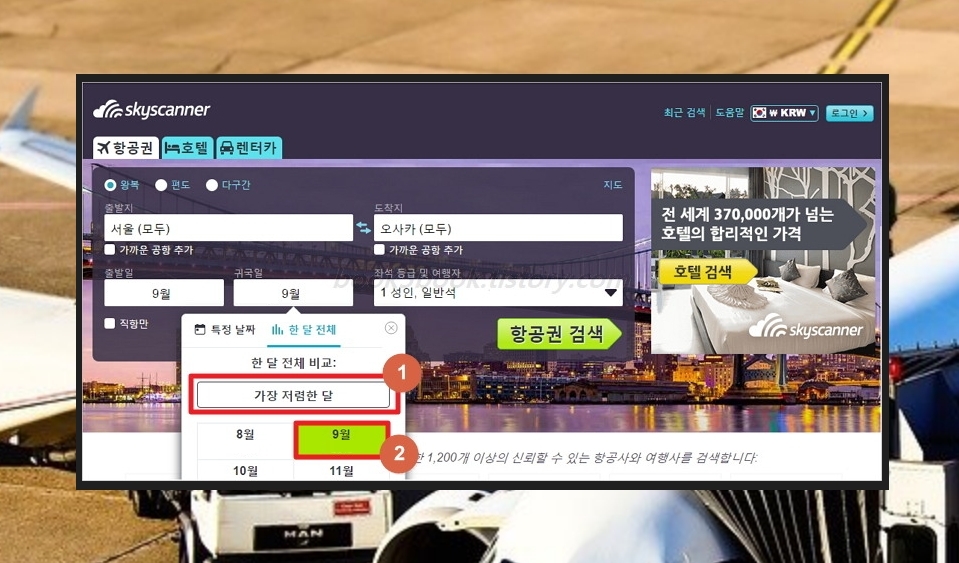 2단계에서 '항공권 검색'을 클릭한 후 '차트'를 누르면 가격대를 한눈에 확인하실 수 있는데요. 추석이 끝나는 17일, 18일, 19일에 일본에서 출발하는 티켓의 가격이 매우 높은 것을 알 수 있습니다. 이에 반해 9월말에는 10만원 대 이하로 꽤 저렴하네요.