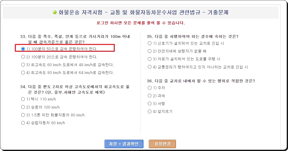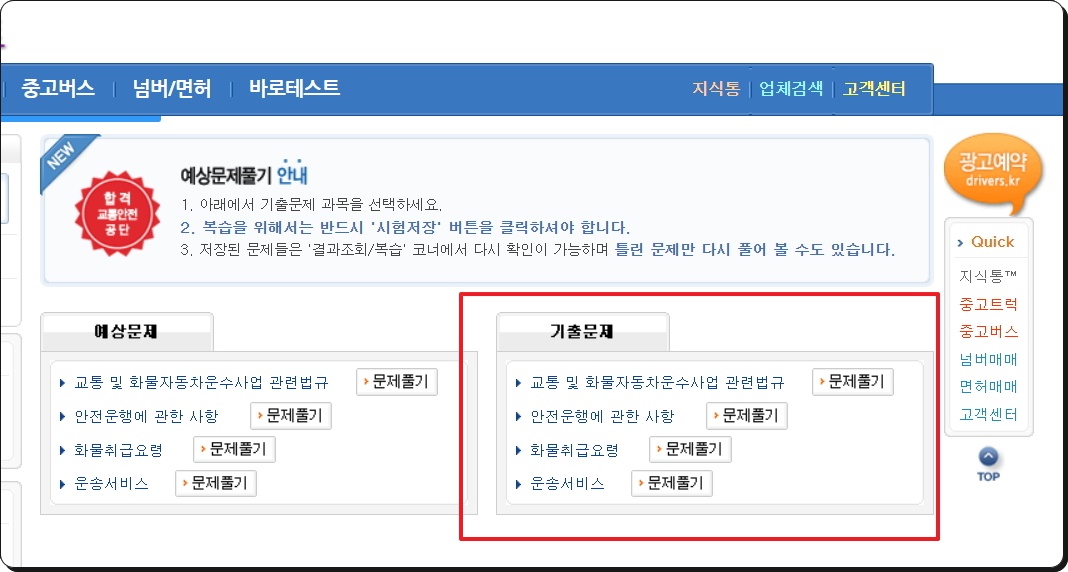 버스운전이 아닌 화물운송 자격시험을 선택한 것이 이상하게 생각되실텐데요. 다음 단계에서 보면 화물운송과 버스운전의 과목이 많이 겹칩니다. 그렇기 때문에 시험 준비를 할 때 이곳의 문제를 이용할 수 있는 것이죠. 그럼 기출, 예상, 실전 문제 중에서 풀어보고 싶은 것을 선택해 주세요.