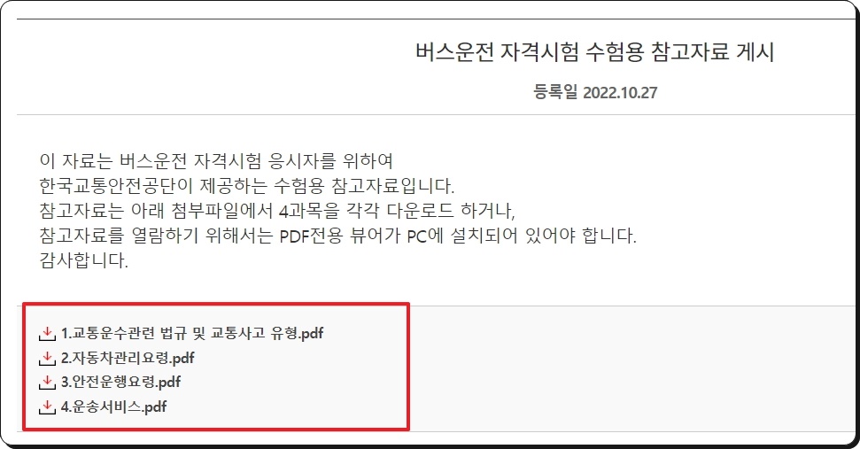 버스운전 자격시험에 해당하는 4가지 과목인 교통운수관련 법규 및 교통사고 유형, 운송서비스, 안전운행요령, 자동차관리요령에 대한 수험용 참고자료를 아래에 첨부하였습니다. PDF 파일로 되어 있기 때문에 쉽게 열 수 있는데요. 혹시 컴퓨터에서 해당 문서가 열리지 않는다면 PDF 뷰어 프로그램을 찾아서 설치해 주세요. 무료로 사용할 수 있는 뷰어가 많이 있습니다.