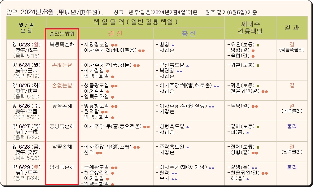 일별로도 좋은 이사방위를 파악하는 것이 가능한데요. 여기에는 손 없는 날에 대한 정보도 제공하고 있네요. 좀 더 깊이 있게 알아보고 싶은 분들은 참고해 보세요.