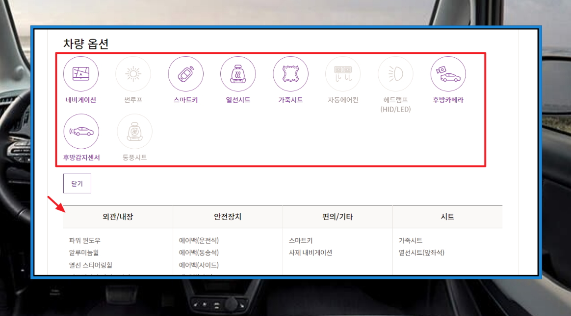 레이를 신차로 구매할 때에는 옵션을 내 마음대로 추가하거나 뺄 수 있는데요. 중고차의 경우에는 변경이 불가합니다. 그렇기 때문에 차량 옵션에 대한 내용을 꼭 확인해 보시길 바랍니다. 단순히 가격이 싸다고 해서 옵션이 너무 없는 차량을 선택하는 것은 위험합니다. 필수 옵션 정도는 갖추고 있어야 운전함에 있어서 불편이 없기 때문입니다. 제 경우에는 후방감지센서 정도는 필수라고 봅니다. 후방카메라나 네비게이션의 경우에는 본인이 직접 추가할 수 있는 부분이기 때문에 중요하지만, 넘기셔도 괜찮습니다.
