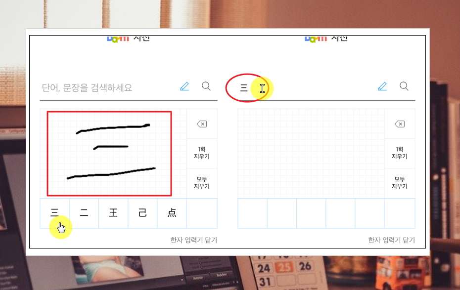 우리가 사용할 필기인식기 기능이 생겼습니다. 검색창 아래에 있는 인식기 안에 써서 찾고 싶은 한자를 그려보세요. 그럼 바로 아래에 여러 개의 문자가 나타납니다. 자신이 찾으려고 했던 것을 선택해 주세요. 그럼 바로 검색창에 해당 한자가 입력이 되는데요. 이 상태로 문자를 추가 입력하거나 검색 버튼을 눌러 사전 정보 찾기를 진행할 수 있습니다.