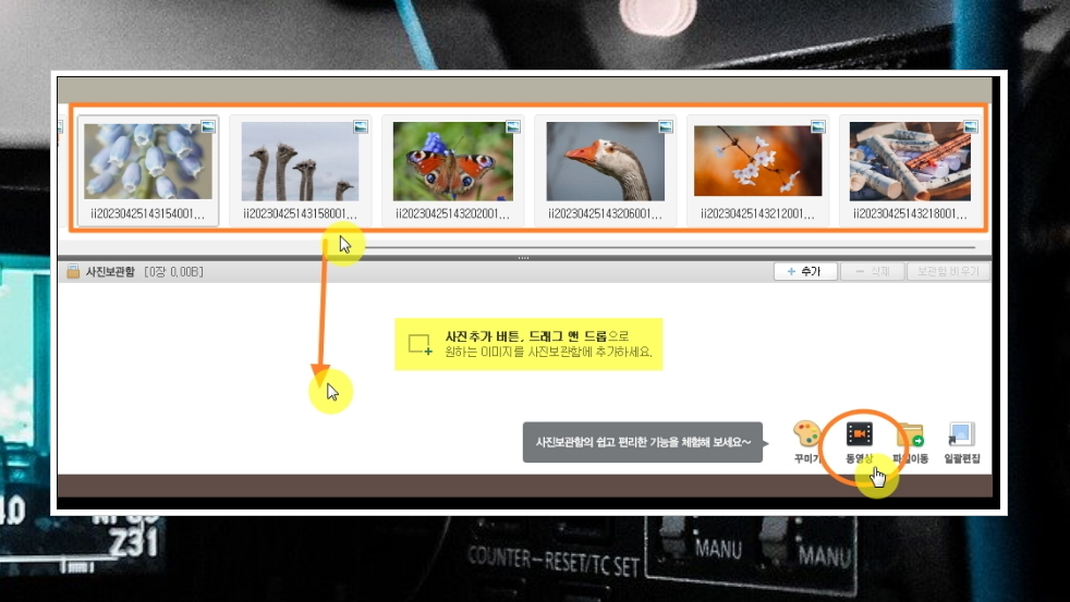 알씨에는 사진으로 동영상 만드는 프로그램이 내재되어 있습니다. 알씨를 실행한 후 우측 하단에 있는 보관함에 작품에 넣을 사진을 추가해주세요. 그 다음 [동영상] 버튼을 누르면 제작툴이 나타납니다.