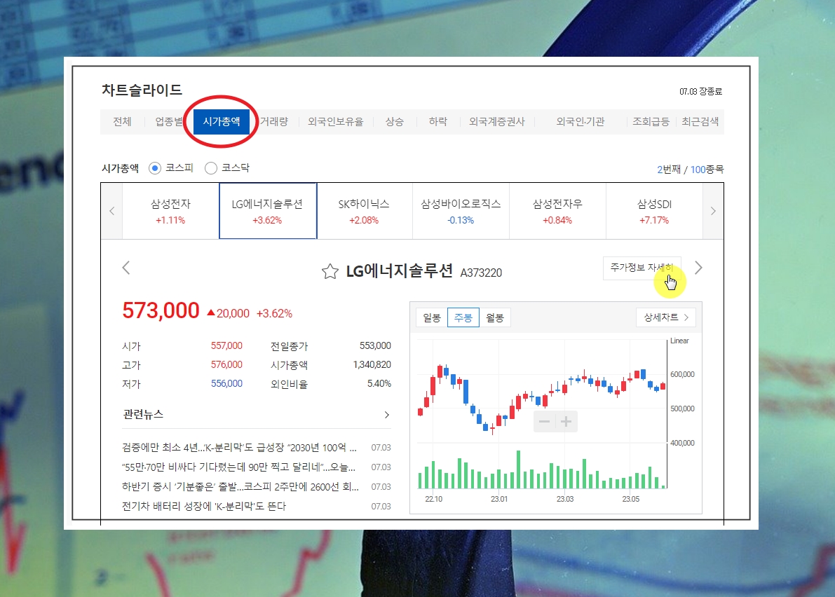 5. 차트 슬라이드 메뉴를 보면 시가 총액, 거래량, 외국인 보유율, 상승, 하락 등이 보이는데요. 각 메뉴를 선택하면 해당 기준을 바탕으로 차트 슬라이드에 구성 종목이 달라집니다. 예를 들어 시가총액을 선택했다면 시가총액이 높은 순서대로 주식 전종목 시세를 볼 수 있어요.