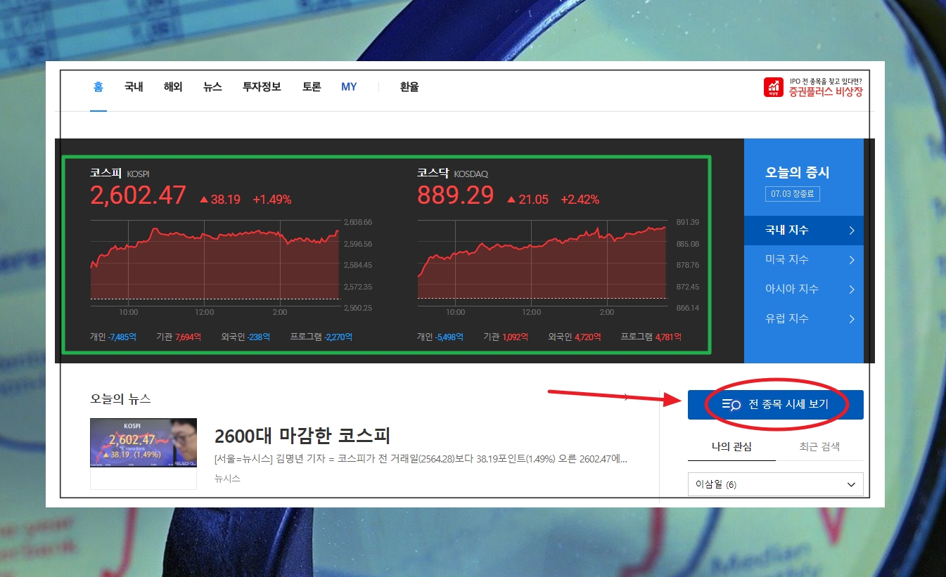 2. 전종목에 대한 시세정보도 중요하지만, 증권 투자를 할 때에는 코스피와 코스피 지수를 하루에 한 번 볼 필요가 있습니다. 이러한 중요성을 알고 있다는 듯이 다음 증권 사이트에서도 내 먼저 확인할 수 있는 부분인데요. 국내 지수인 코스피와 코스닥은 물론이고, 미국, 아시아, 유럽을 대표하는 지수도 확인이 가능합니다.