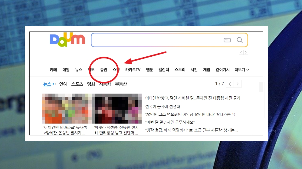 1. 국내 it 기업을 대표하는 곳 중 하나인 다음에서는 주식 시세 관련하여 상당히 높은 수준의 서비스를 제공하고 있습니다. 어떤 식으로 대단한 것을 제공하는지 직접 보여 드리도록 하겠습니다. 그럼 다음 홈페이지에서 메뉴에 있는 증권을 선택해 주세요.