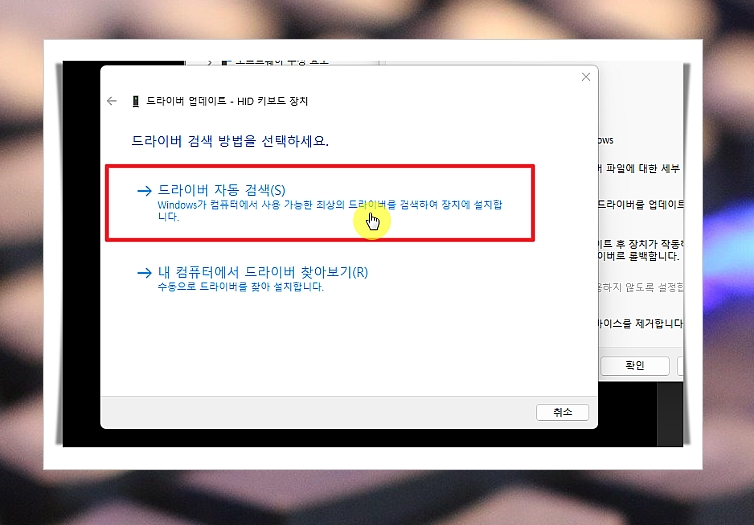 6. 드라이버 업데이트 창이 열리면 "드라이버 자동 검색" 방법을 선택해 주세요. 일반적으로 많이 사용되는 키보드의 경우에는 해당 방법을 통해 드라이브 업데이트를 할 수 있는데요. 조금 특별한 키보드를 사용하는 경우에는 제조사 홈페이지에서 키보드 전용 드라이버 프로그램을 다운 받아 설치해야 합니다.