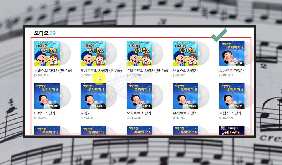 69개의 오디오 컨텐츠가 검색되었습니다. 브람스의 곡은 466,359회나 조회가 되었을 정도로 인기가 많아요. 그 외에 모차르트, 슈페르트, 브람스 등의 곡이 마련되어 있습니다. 모두 무료 듣기 가능합니다.