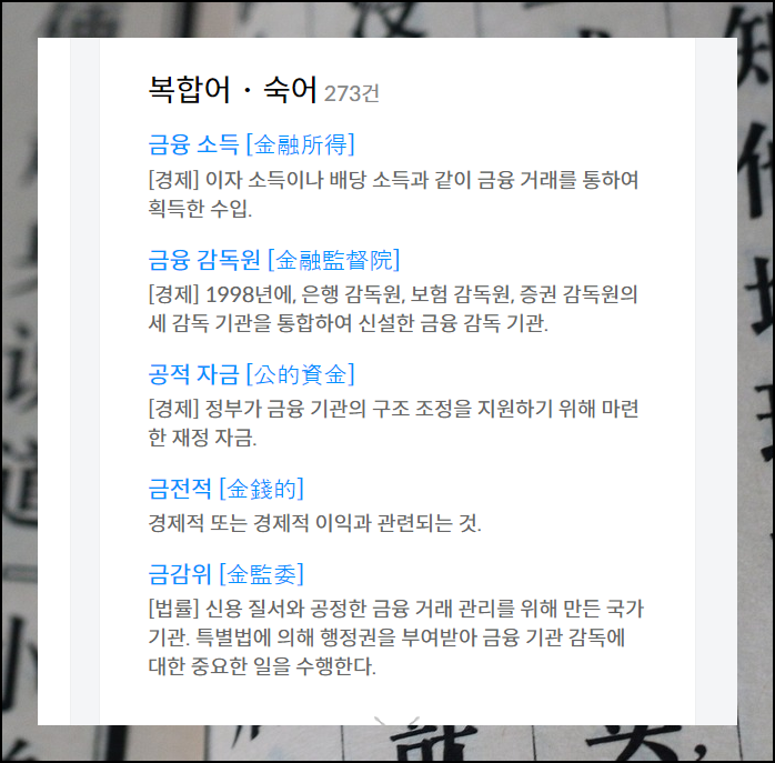 한문 공부를 하는 분이라면 복합어와 숙어 부분도 꼭 보시길 바랍니다. 단어나 고사성어를 선택했을 떄에는 이에 대하여 상세한 뜻과 예문 확인이 가능합니다. 다음사전에서는 예문을 많이 제공하기 때문에 한문 연구나 학습에 매우 유용합니다.
