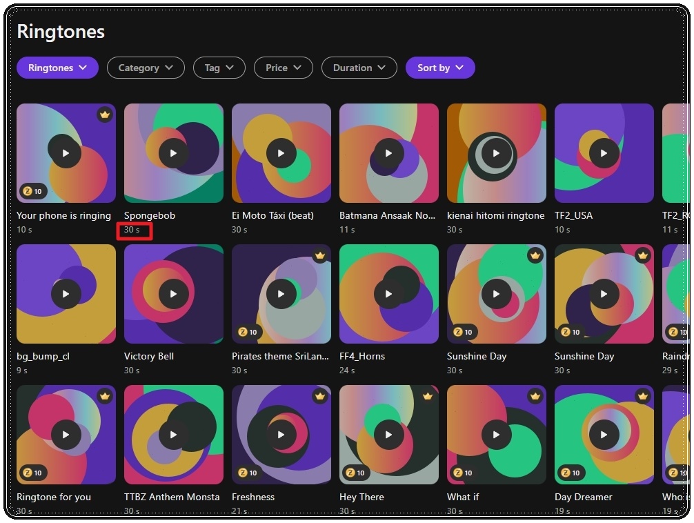 사이트에 접속하면 벨소리를 의미하는 "Ringtones"라는 단어가 포함된 메뉴를 선택해 주세요. 아이폰이나 안드로이드 전용 벨소리 무료다운받는곳으로 이동이 가능합니다. 그런 구분 없이 많은 음원을 찾아보고 싶다면 "Ringtones"를 선택하면 돼요. 결과가 나왔는데요. 꽤 많은 자료가 나왔습니다. 이름과 함께 숫자가 아래에 표시되어 있는데요. 이것은 재생 시간을 의미합니다.