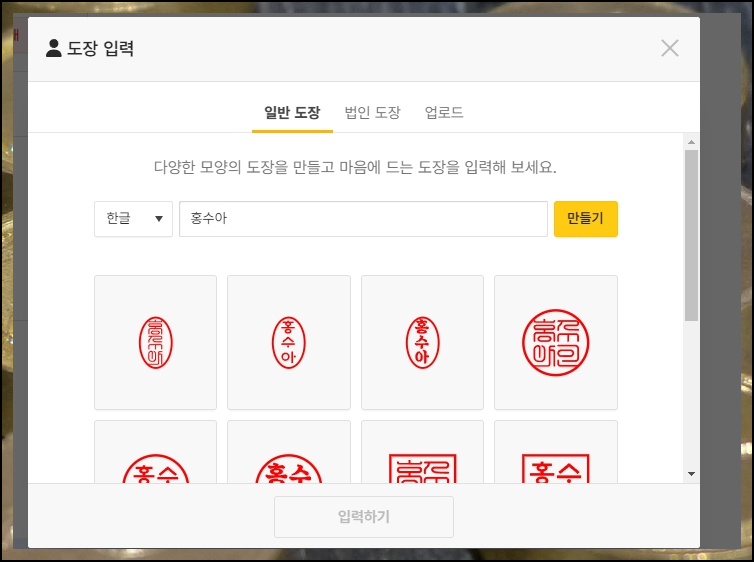이곳에서 진행할 수 있는 무료도장 제작 방식은 3가지가 있는데요. 첫 번째는 일반 버전입니다. 주로 개인용으로 사용할 때 만드는 것이죠. 그냥 한자 또는 한글로 된 이름을 입력한 후 [만들기] 버튼을 누르면 됩니다. 그럼 여러 가지 디자인이 나타나는데요. 여기에서 마음에 드는 것을 클릭하면 돼요.