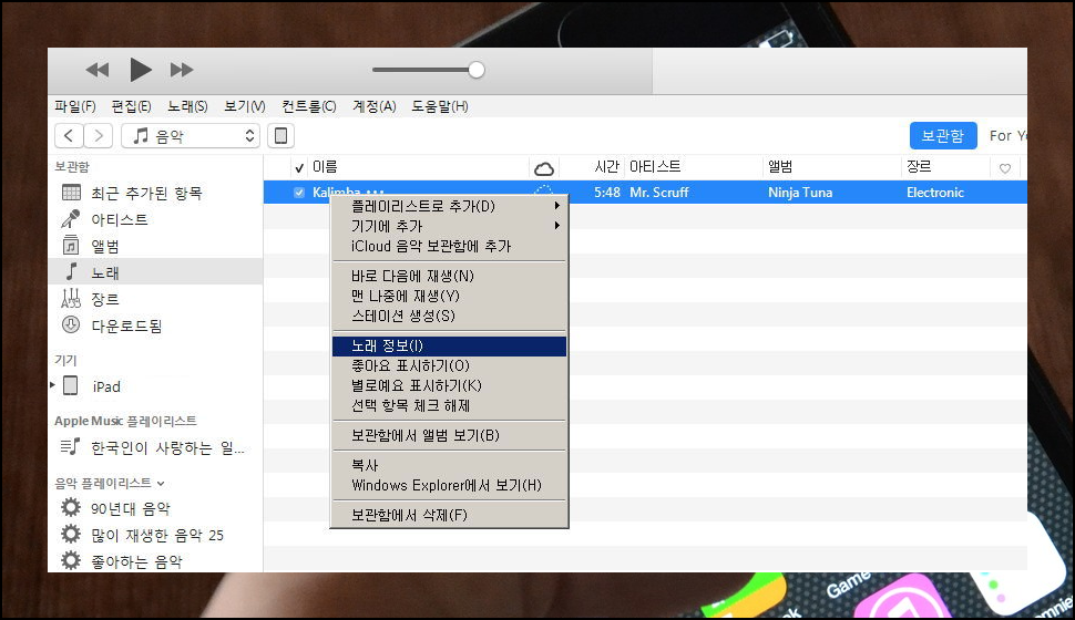 추가한 파일을 마우스 우클릭을 한 후 노래 정보를 클릭해 주세요.