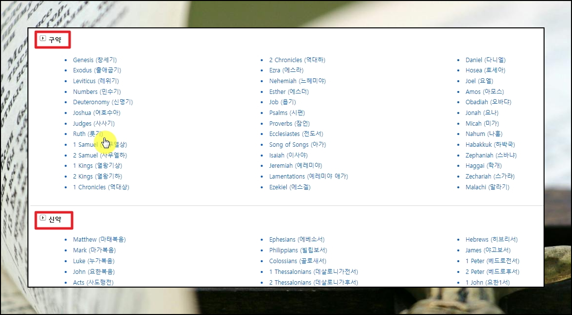 새롭게 페이지가 열리면서 구약과 신약에 속하는 모든 챕터 리스트가 나타나는데요. 여기에서 읽고 싶은 챕터를 선택해 주세요. 온라인을 통해 창세기, 출애굽기, 레위기 등 모든 챕터에 대한 선택 및 읽기 가능합니다.