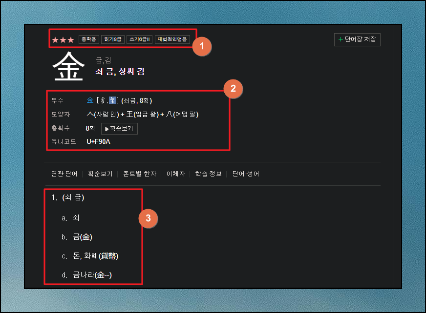 모르는 한자에 대한 상세 페이지가 열렸습니다. 난이도, 대법원 인명용 여부, 부수, 모양자, 총획수, 유니코드와 같은 정보와 함께 많은 뜻을 만나볼 수 있습니다. 두꺼운 책으로 되어 있는 옥편보다 훨씬 많은 사전 정보를 이곳에서 얻을 수 있습니다.