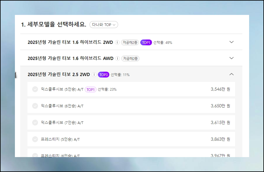 보통 차량을 구매할 때 본인이 어떤 세부모델을 선택할지 정해놓는데요. 그냥 차량 가격을 알아볼 때에는 정해 놓지 않을 수 있어요. 그런 경우에는 인기모델 TOP3를 참고하면 돼요.