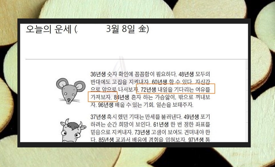 과거 매일경제 신문을 통해 볼 수 있던 것과 똑같아요. 쥐띠부터 돼지띠까지 태어난 연도에 따른 운세를 확인할 수 있는데요. 한 줄도 안되는 짧은 한 구절인데요. 오히려 짧기 때문에 머릿속에 강렬하게 남는 것 같아요. 72년생 쥐띠이신 분들은 내일을 기다리는 여유를 가져보라고 하는데요. 이처럼 의미심장한 메세지를 받을 수 있어서 좋아요.