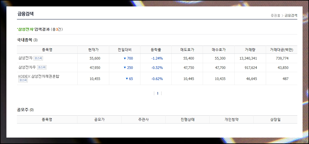 관심 있는 특정 종목에 대한 정보와 뉴스를 얻고 싶다면 검색 기능을 활용해보세요. 예시로 시가총액 1위 기업인 삼성전자에 대해 살펴보도록 하겠습니다. 검색어 자동완성 기능이 있어 정확한 종목명을 몰라도 쉽게 찾을 수 있어요.