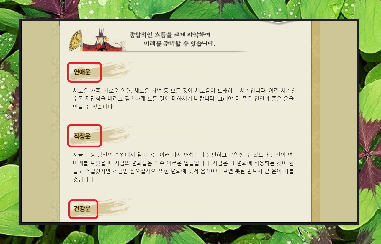 한해에 들어오는 연애, 직장, 건강, 금전 등 여러 분야의 해당하는 운세를 알아보는 것도 가능합니다.