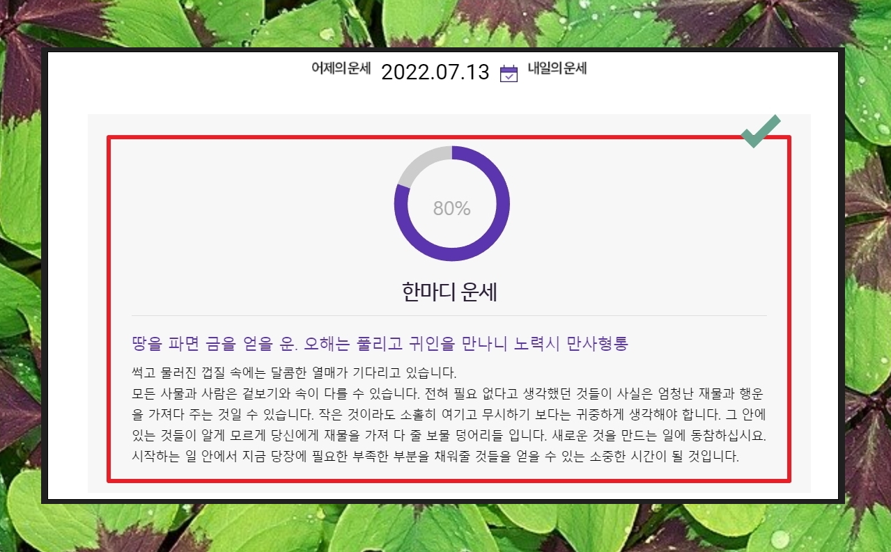 결과가 나왔습니다. 간단한 점수로 오늘 얼마나 운이 좋은지 확인이 가능합니다. 여기에 더하여 상세한 풀이를 만나볼 수 있는데요. 단순이 오늘 어떤 일을 겪게 되는지 알려 주는 것뿐만 아니라 어떤 것을 조심해야하고, 어떻게 삶의 태도를 지녀야 더 긍정적인 삶을 살 수 있는지 알려 줍니다.