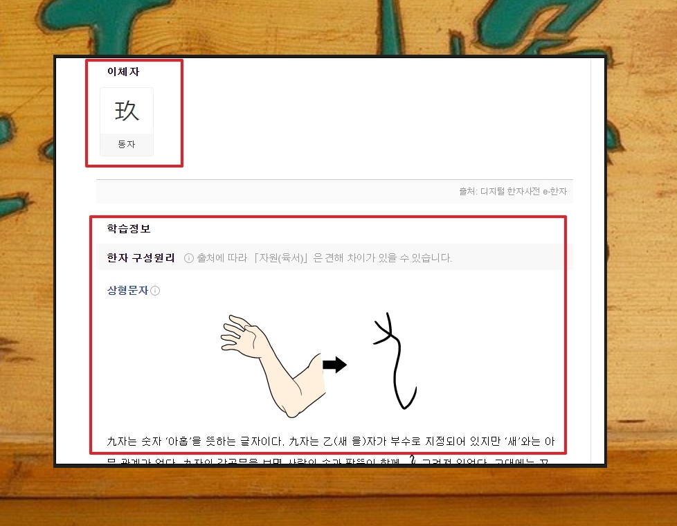 개인적으로 한문 공부를 하는 경우라면 학습정보에 있는 상형문자 부분을 읽어보는 것이 좋다고 생각합니다. 그냥 암기하는 것보다 이렇게 한자의 구성원리를 이해하면서 외우면 학습 효과가 좋을 가능성이 높기 때문입니다.