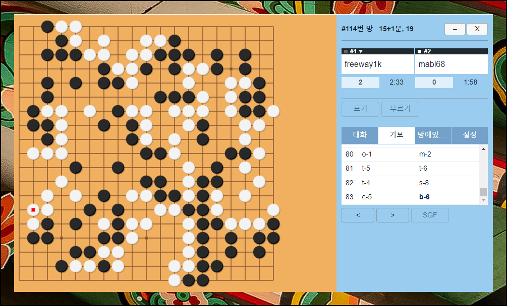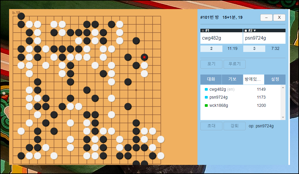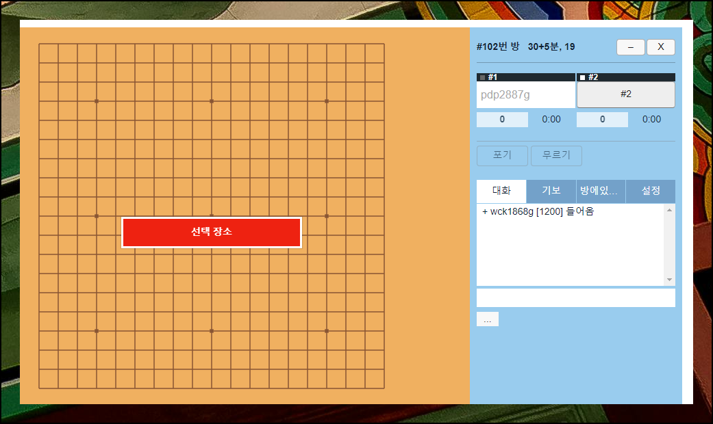 대국을 펼칠 수 있는 방을 선택하면 바둑을 바로 시작할 수 있어요. 우측에는 대화 기능과 기보 확인 등 다양한 기능이 있으니 활용해보세요. 무료로 제공되는 편리한 기능들이 많답니다.