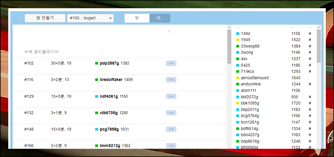 다양한 대국방이 준비되어 있어요. 직접 방을 만들거나 다른 사람의 방에 참여해서 게임하기를 시작하세요. 초보자부터 고수까지 수준별 대국이 가능합니다.