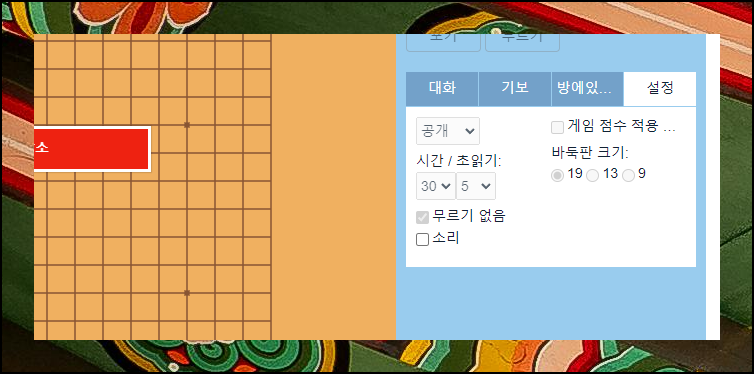 점수 적용부터 바둑판 크기까지 원하는 대로 설정할 수 있어요. 소리나 부르기 기능도 자유롭게 조절이 가능합니다. 게임하기 전에 꼭 확인해보세요.