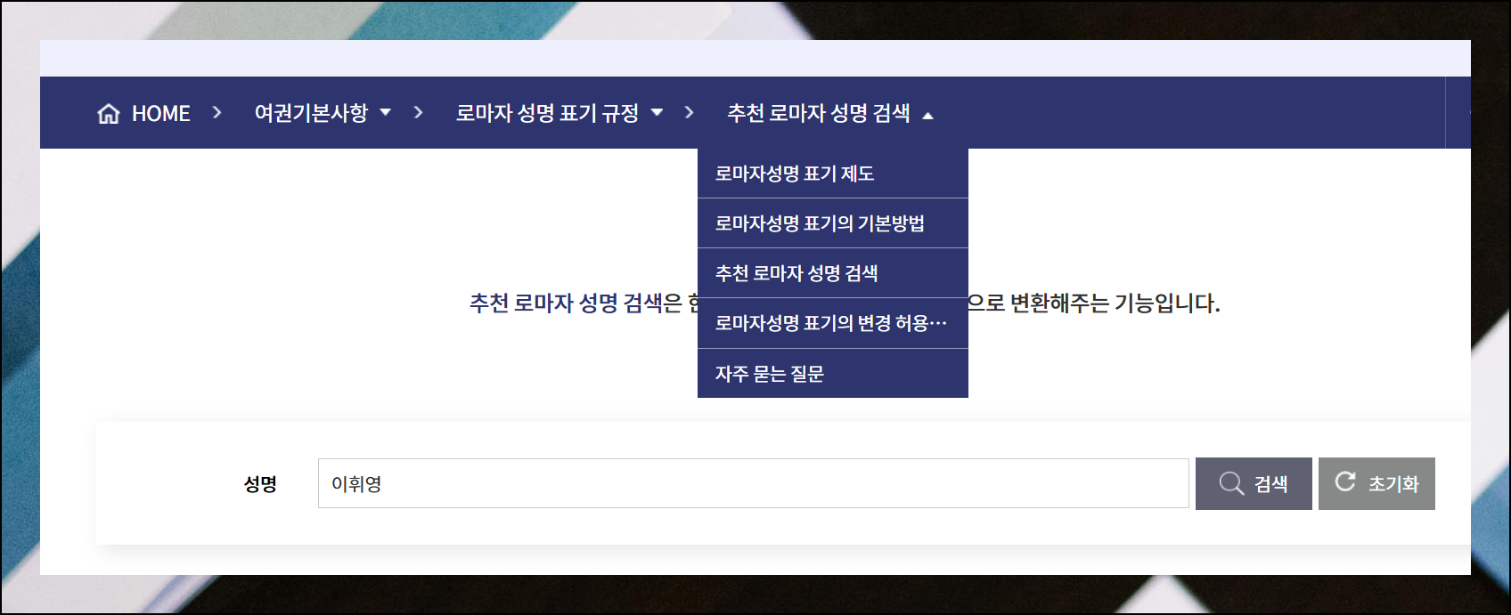 사이트에 접속하면 로마자 성명 표기에 대한 기본 방법을 확인할 수 있는데요. 이러한 내용을 바탕으로 직접 변환하는 것도 가능합니다. 자동으로 진행하고 싶은 경우에는 메뉴에 있는 "추천 로마자 성명 검색" 버튼을 눌러주세요. 그 다음 실제로 사용하는 한글 이름 입력 및 확인 버튼을 눌러주면 됩니다. 그럼 결과값을 받아볼 수 있어요.