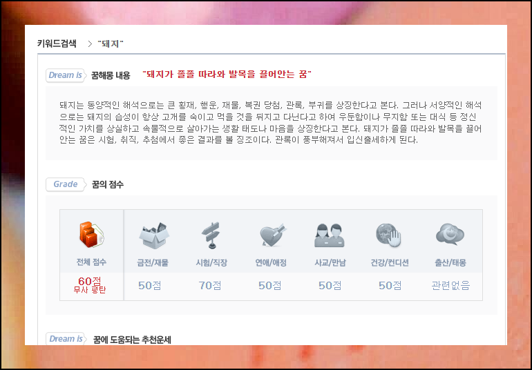 꿈에서 돼지가 나타나면 좋은 의미라고들 하죠. 실제로 어떤지 무료풀이로 한번 살펴볼까요? 예를 들어 돼지가 발목을 끌어안는 꿈을 분석해보았는데요. 전체 운세는 60점으로 보통이지만, 시험이나 직장 운이 70점으로 높게 나왔어요. 승진이나 시험 합격의 기회가 올 수 있다는 의미입니다. 이러한 결과를 통해 앞으로의 운세를 미리 준비해보세요.
