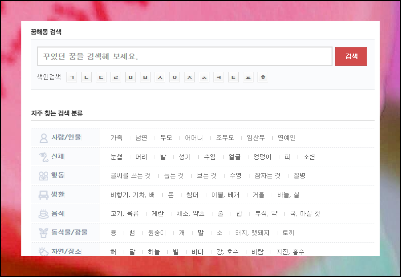 꿈해몽을 찾는 방법은 두 가지예요. 키워드로 직접 검색하거나 카테고리에서 원하는 항목을 고르는 방식입니다. 어떤 방법을 선택하더라도 무료풀이 결과를 동일하게 볼 수 있으니, 본인에게 편한 방법을 이용하시면 됩니다. 검색에 익숙하지 않은 분들은 카테고리 방식을 추천해요.