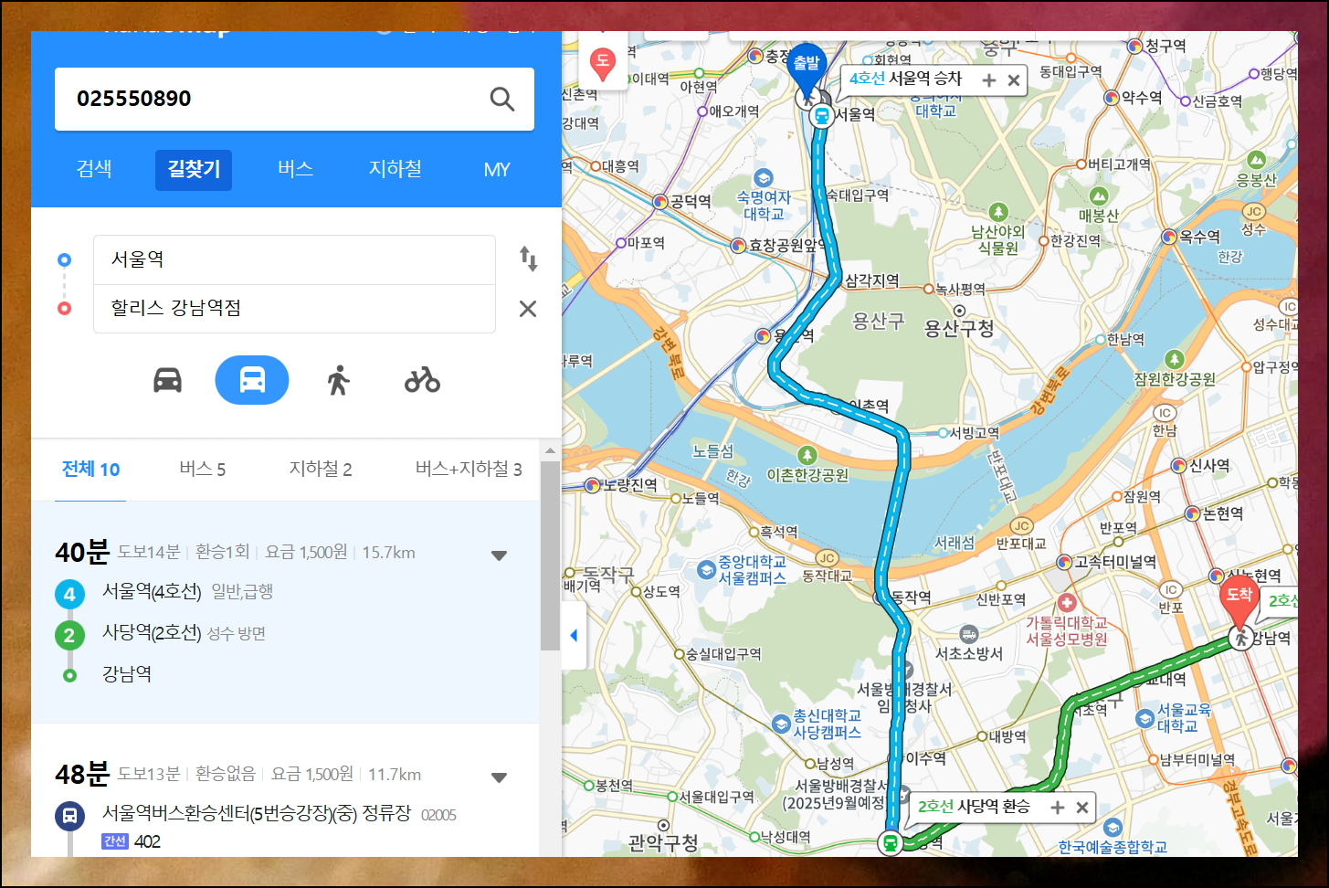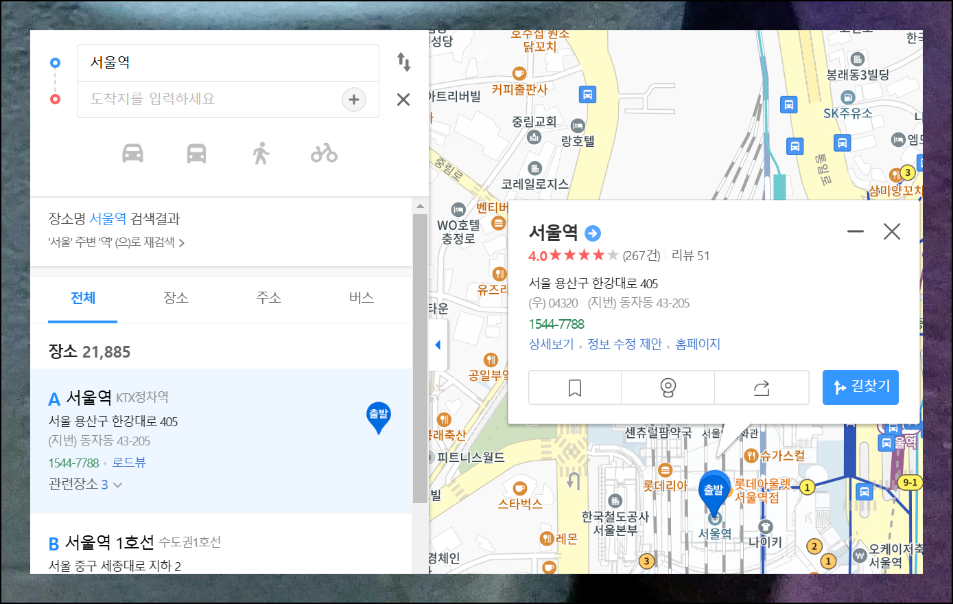 조회 결과에서 '길찾기' 버튼을 누르면 최적의 경로를 안내받을 수 있습니다. 목적지는 자동 설정되고, 출발지를 지정해주세요. 저는 서울역을 지정했는데요. 간단하게 현재 위치를 선택해도 됩니다. 원하는 이동수단을 선택하면 즉시 최적 루트와 예상 소요시간을 알려줘요. 이렇게 전화번호만 알아도 주소 찾기와 길 안내까지 한 번에 해결됩니다.