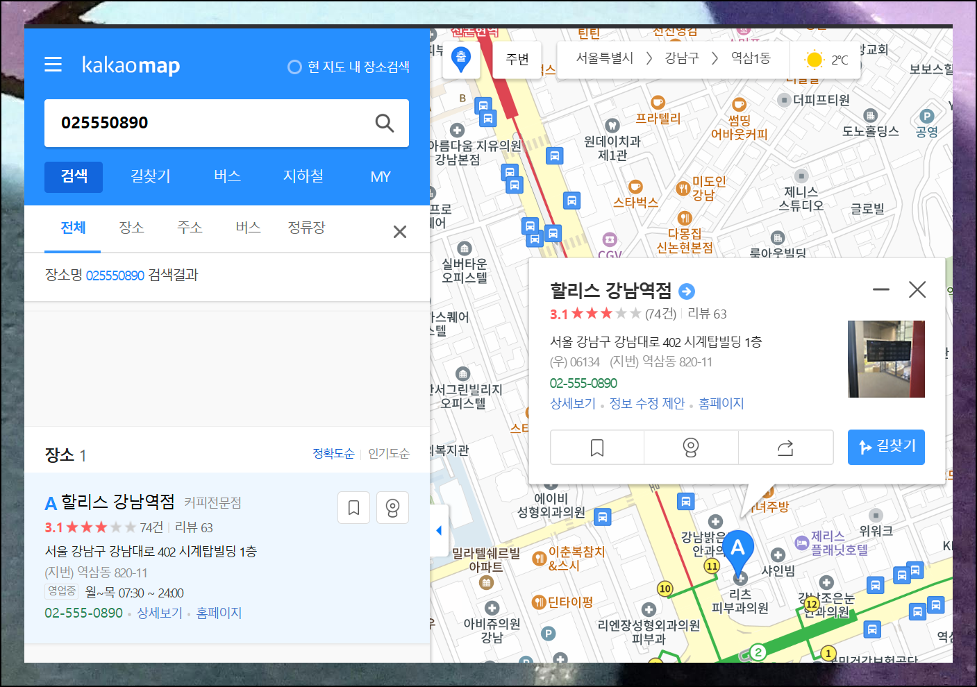화면 좌측 상단의 입력창에는 보통 상호명이나 지역명을 입력하는데요. 여기에 주소찾기 원하는 전화번호를 넣어보세요. 예를 들어 카페 번호를 입력하면 정확하고 상세한 주소는 물론이고, 영업시간, 위치데이터까지 한눈에 파악할 수 있습니다. 하이픈 유무에 관계없이 조회가 가능해요.