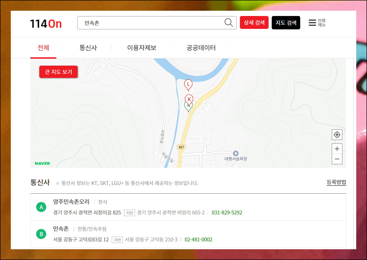 다음지도에서 확인되지 않는 곳의 경우에는 114 사이트를 이용해보세요. 온라인으로 간편하게 알아볼 수 있습니다. 새로 오픈한 매장이나 소규모 가게도 114에서는 대부분 정보를 얻을 수 있어요.