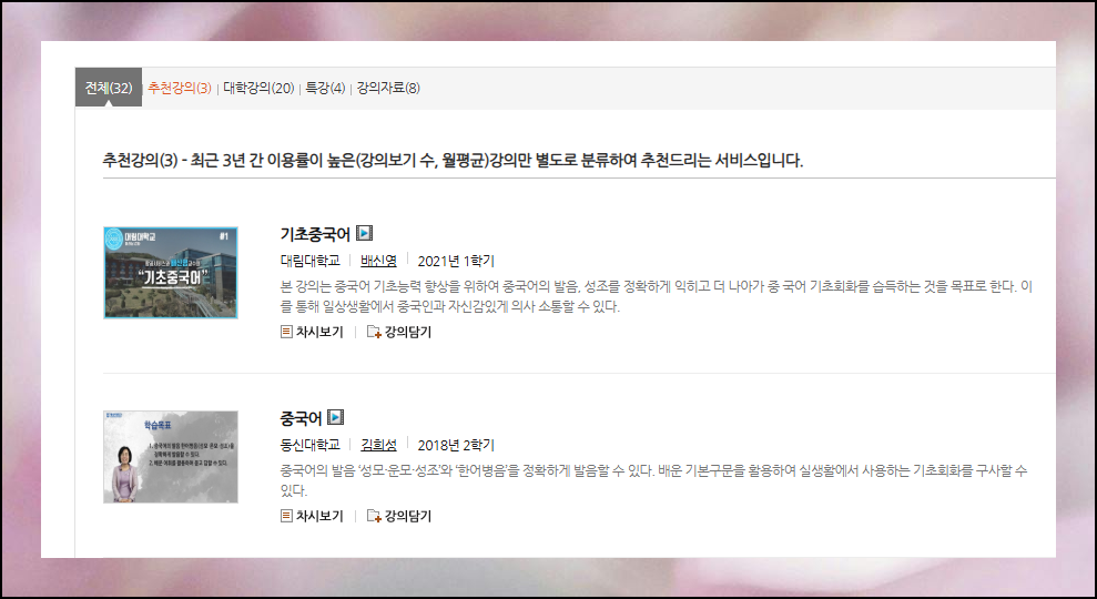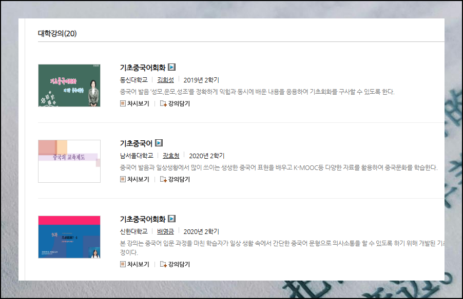 우리가 찾은 강좌 자료는 32개나 마련되어 있습니다. 각 수업은 한 학기 커리큘럼을 담고 있어 중국어를 체계적으로 익히기에 최적화되어 있어요. 기초 문법을 탄탄히 다질 수 있는 강의부터 실용 회화까지, 모든 학습자의 요구를 충족시키는 자료가 무료로 제공됩니다.