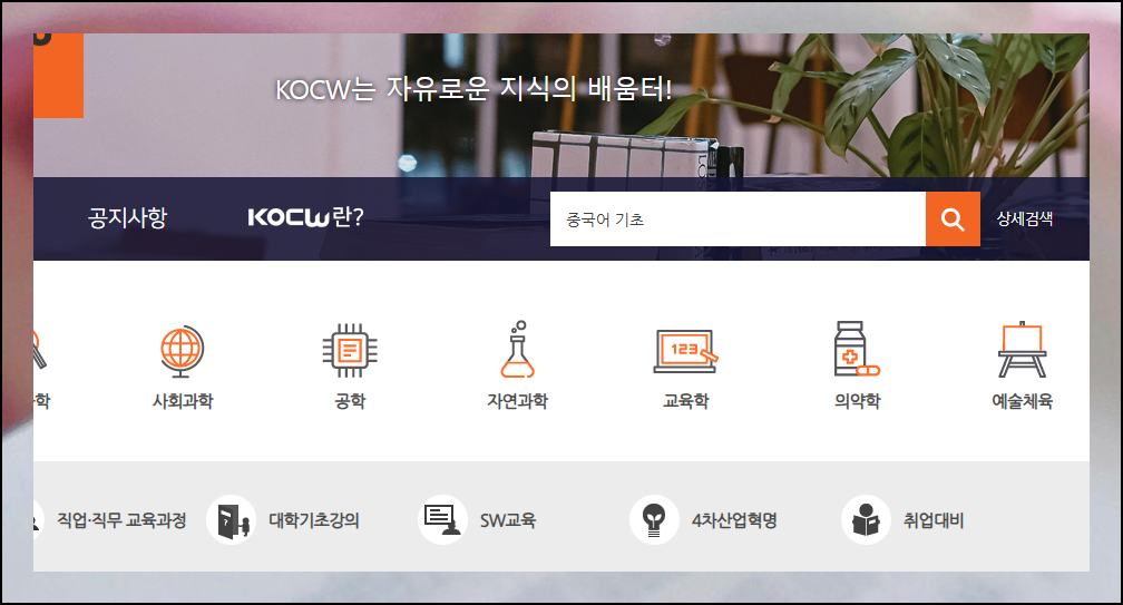 KOCW는 배움을 향한 열정이 있는 모든 분들에게 무료 강의를 제공하는 특별한 공간입니다. 중국어를 포함한 다양한 외국어의 기초부터 심화과정, 회화와 독해까지 원하는 영역을 마음껏 탐구할 수 있어요. 처음 공부를 시작하는 분들도 부담 없이 기초부터 완성할 수 있는 환경이 마련되어 있습니다.