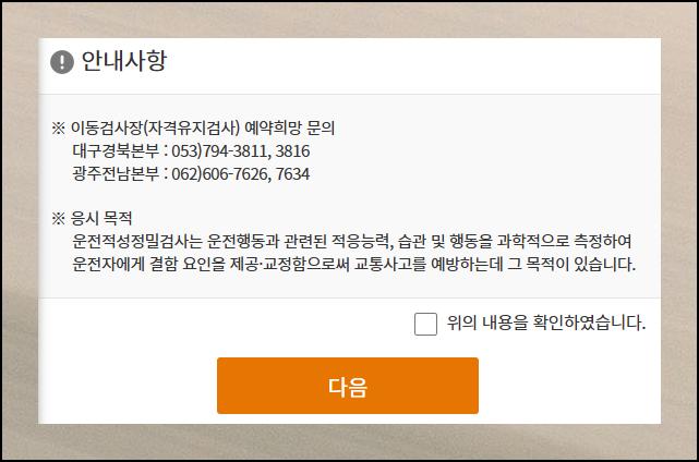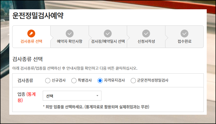 사이트에 접속하면 "정밀검사 예약" 메뉴를 선택하면 테스트 종류와 업종 선택 화면이 나타납니다. 원하는 시험 장소와 날짜를 선택한 후, 신청서 작성을 마치면 예약을 할 수 있습니다. 고령 운전기사 자격유지검사는 각 단계가 화면의 지시에 따라 순차적으로 진행되므로 누구나 쉽게 예약할 수 있어요.