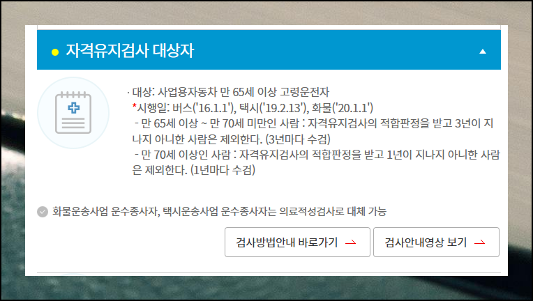 사업용 차량을 운행하는 만 65세 이상 고령 운전기사라면 자격유지검사가 필요합니다. 연령대별로 평가 주기가 달라요. 만 65세 이상에서 만 70세 미만은 3년마다 테스트를 받아야 하고, 만 70세 이상은 매년 검사를 받아야 해요. 화물운송이나 택시 기사분들은 대체 가능한 심사도 있으니 확인해보세요.