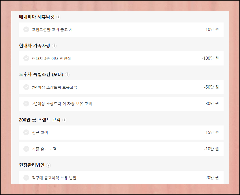본인에게 해당하는 할인 조건을 모두 선택하면 그만큼 지출이 줄어듭니다. 앞서 확인한 판매조건 중 적용 가능한 항목을 모두 표시해보세요. 놓치기 쉬운 직업 할인이나 특별 프로모션도 꼼꼼히 확인하는 것이 좋습니다.