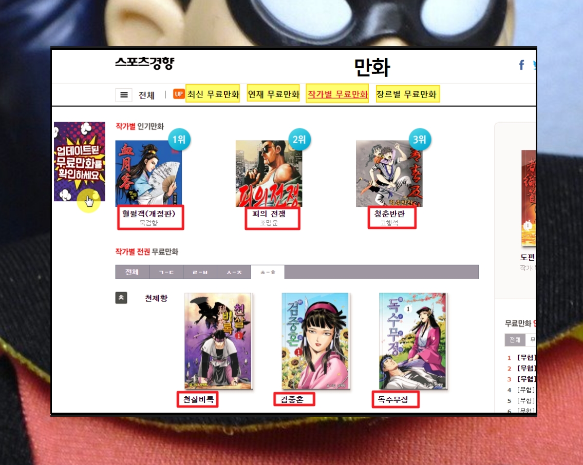 스포츠경향은 무료 만화를 볼 수 있는 곳 중에서 가장 유명하다고 할 수 있는데요. 그만큼 만나볼 수 있는 무료 컨텐츠의 수가 많고, 업데이트도 자주 되는 곳입니다. 최근 작가별 인기 목록을 보면 묵검향의 혈월객이 1위, 조명운의 피의 전쟁이 2위, 고행석의 청춘반란이 3위를 차지하고 있네요. 보는 방법은 이전 단계에서 알려드린 사이트와 동일하기 때문에 추가 설명은 자제하도록 하겠습니다.