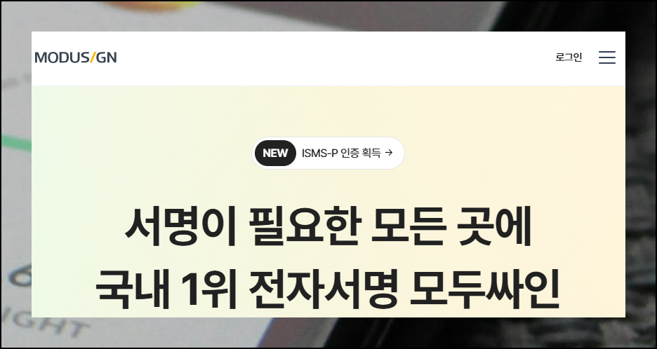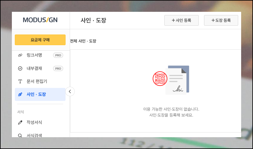 로그인 후 관리 페이지에서 좌측 메뉴 중 [서명] 카테고리의 [사인 및 직인도장]을 선택하세요. 그런 다음 화면 우측 상단의 [등록] 버튼을 누르면 인장 제작 프로그램이 실행됩니다. 구성이 체계적이라 첫 사용자도 헤매지 않고 원하는 기능을 확인할 수 있어요.