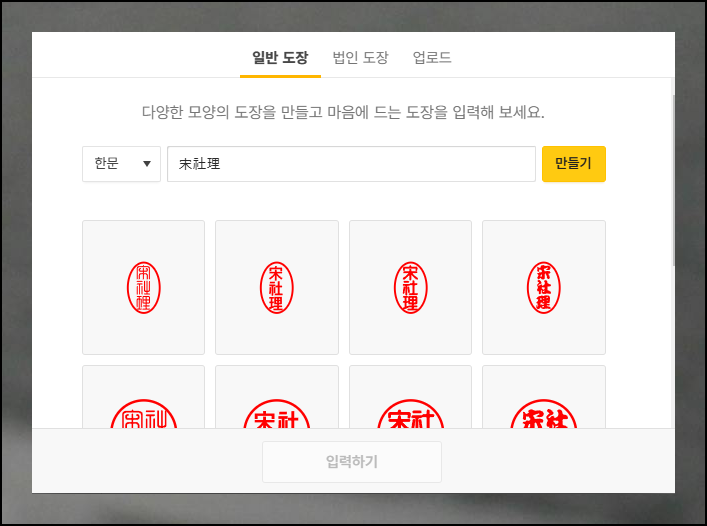 직인 제작은 놀랍도록 간편합니다. 이름이나 회사명을 기입하고 [만들기] 버튼만 클릭하면 다양한 디자인이 자동으로 생성돼요. 표시된 여러 스타일 중 마음에 드는 것을 선택하기만 하면 됩니다. 한글뿐만 아니라 한문 직인도 쉽게 만들 수 있어요. 시스템이 자동으로 한글을 한문으로 변환해주는 옵션도 제공하니 편리해요.