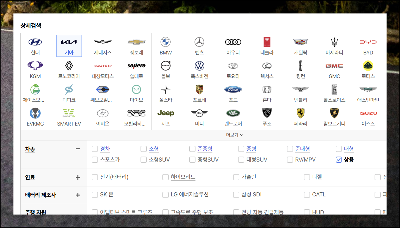 상세 검색 화면에서는 여러 자동차 브랜드가 나열되어 있습니다. 이 중에서 [기아자동차]를 먼저 선택하세요. 브랜드를 고른 후에는 차종 분류에서 [상용]을 클릭하면 됩니다. 단 두 번의 클릭만으로 기아 1톤트럭과 관련된 모든 정보가 화면에 나타날 거예요.