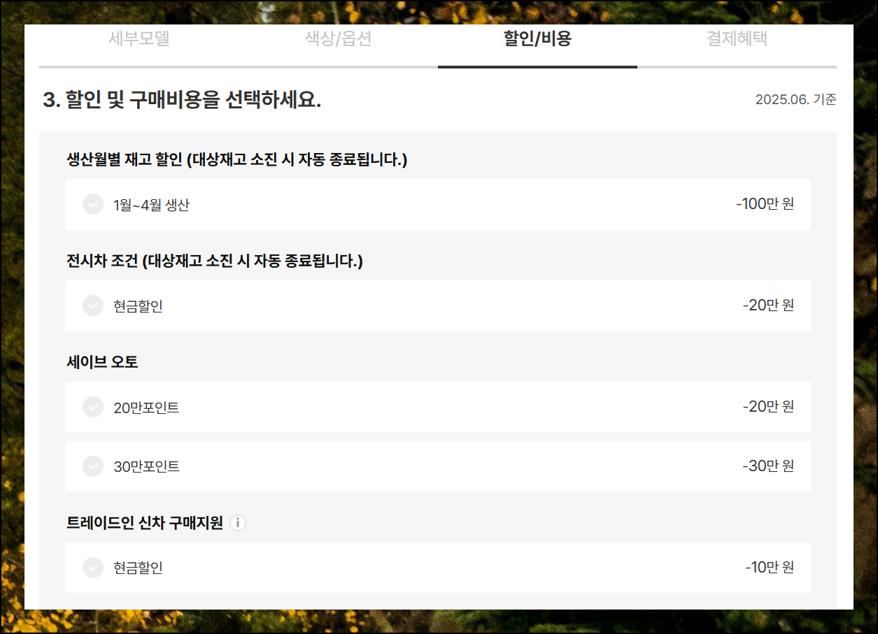 두 번째 단계에서는 추가하고 싶은 옵션을 선택하게 됩니다. 소형 트럭의 특성상 승용차에 비해 선택 가능한 옵션 종류가 제한적이에요. 1톤트럭 신차가격표를 참고하면서 정말 필요한 기능들만 골라서 추가하세요. 세 번째 단계는 이전에 체크한 판매조건을 실제로 적용하는 과정입니다.