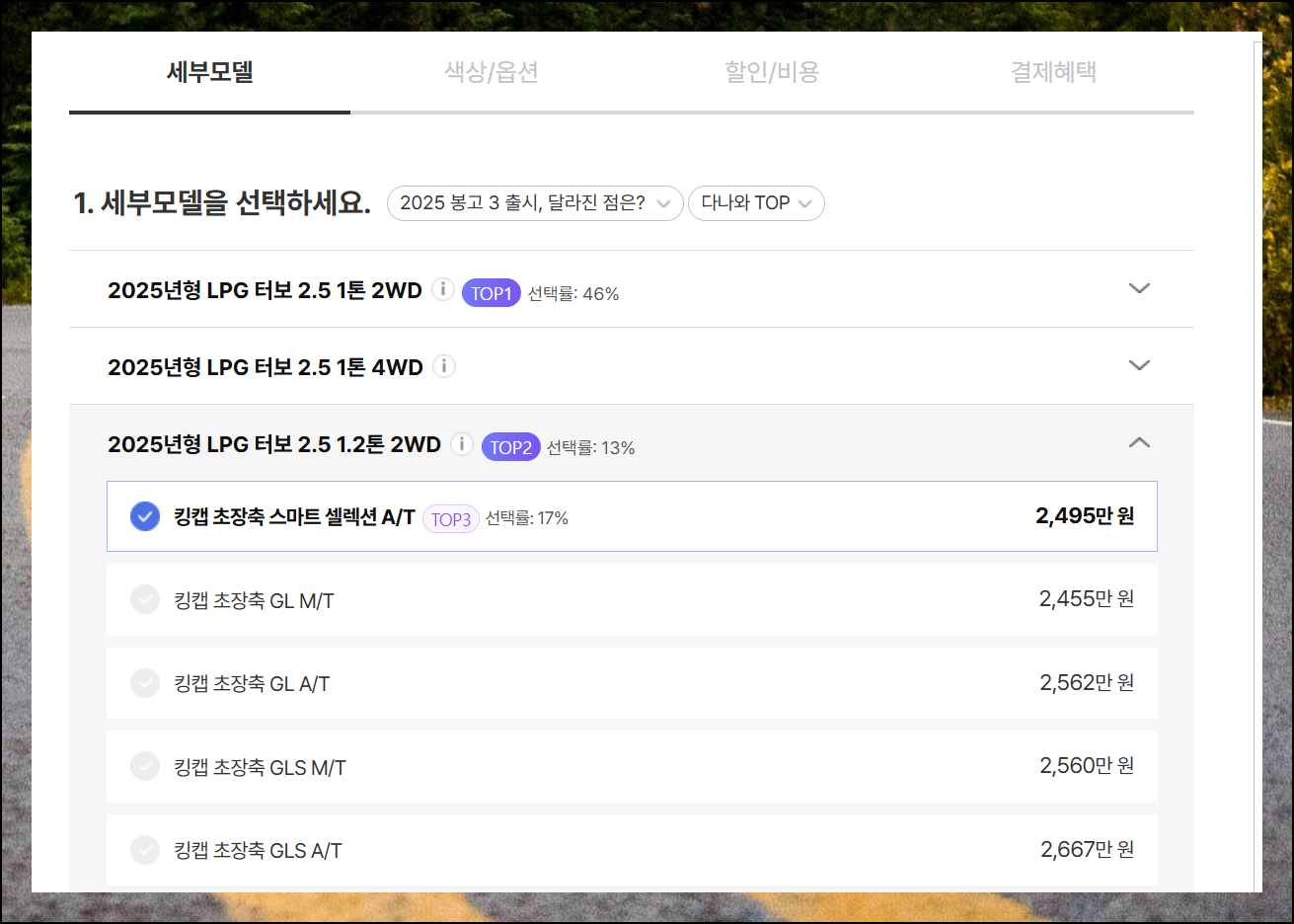 전체 4단계만 거치면 정확한 최종 금액이 포함된 1톤트럭신차 가격표를 받아볼 수 있어요. 가장 첫 번째 단계는 원하는 세부모델을 고르는 것입니다. TOP 표시가 되어 있는 모델들은 다른 구매자들이 많이 선택한 인기 모델이라는 뜻이에요.