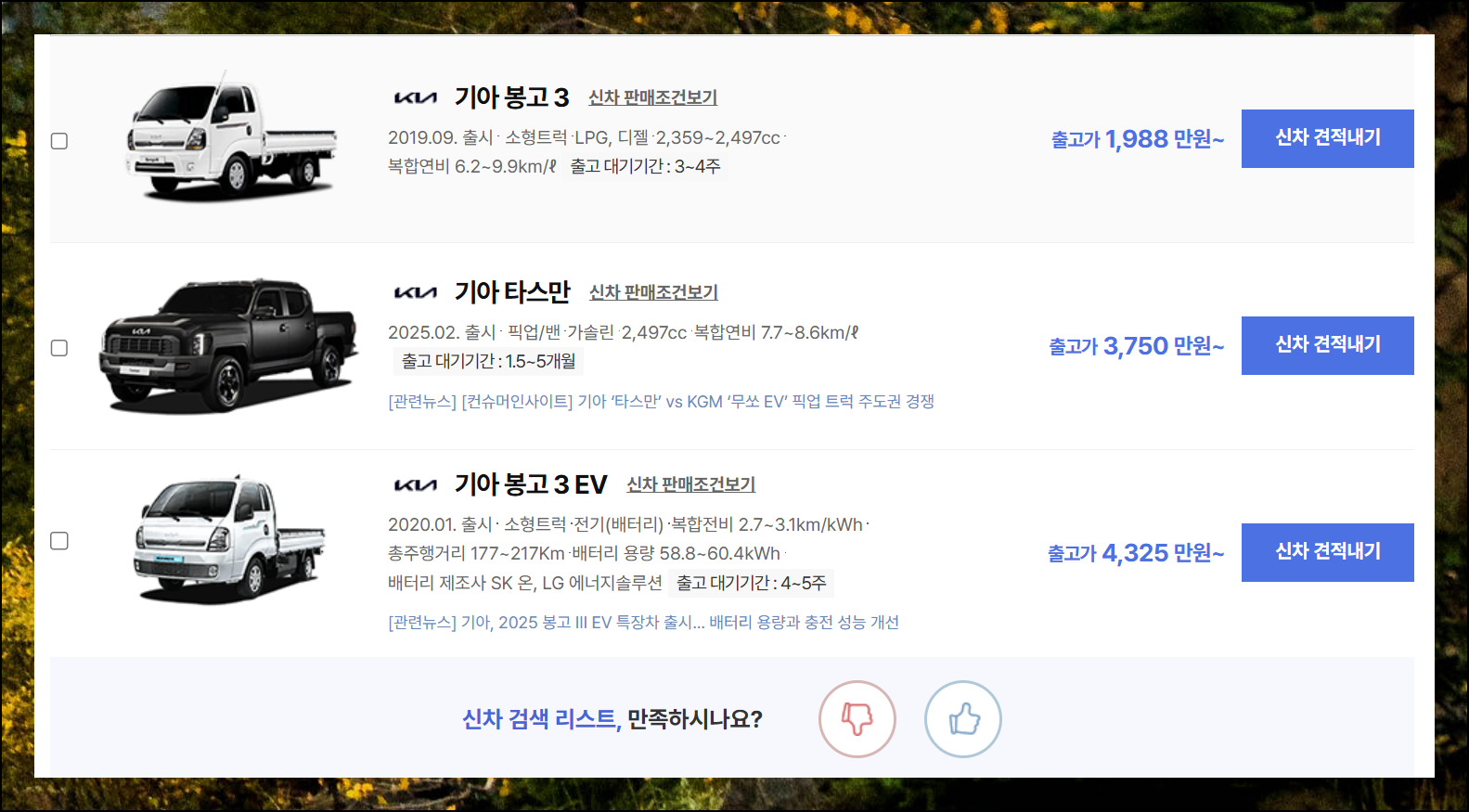 검색 결과로 기본적인 1톤트럭신차 가격표가 화면에 표시돼요. 기아자동차에서 제일 잘나가는 소형 트럭은 "봉고3"입니다.