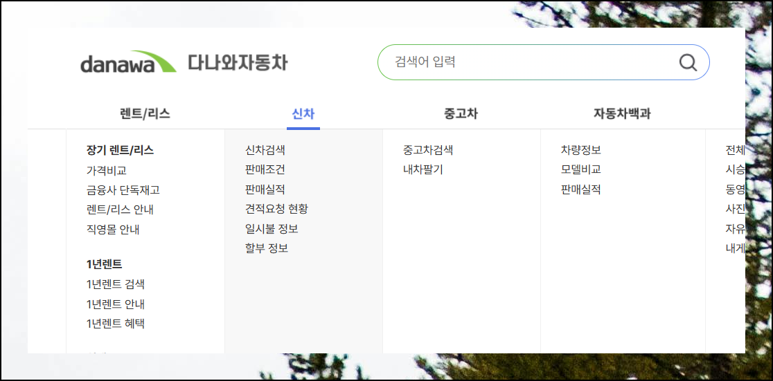 다나와 자동차 웹사이트에 접속하면 깔끔한 메인 화면이 나타나요. 상단 메뉴에서 [신차 검색] 항목을 찾아 클릭해주세요. 화면이 전환되면서 더 자세한 검색 옵션들이 담긴 페이지로 이동할 거예요.