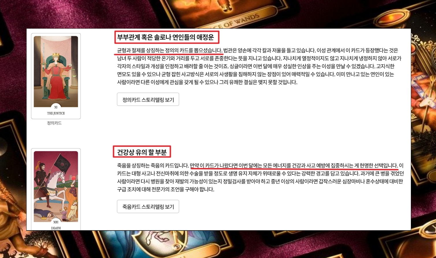 미래의 나에게 어떤 일이 펼쳐질지 궁금할 때 또는 현재 가지고 있는 고민이 있을 떄에는 타로점을 이용해 보세요. 나의 상태에 대해 알려주는 것은 물론이고, 앞으로 어떻게 하면 좋은지 조언을 해주기도 합니다. 이번 시간에는 집에서 편하게 보기 좋은 무료 역술 서비스를 알려드릴게요.