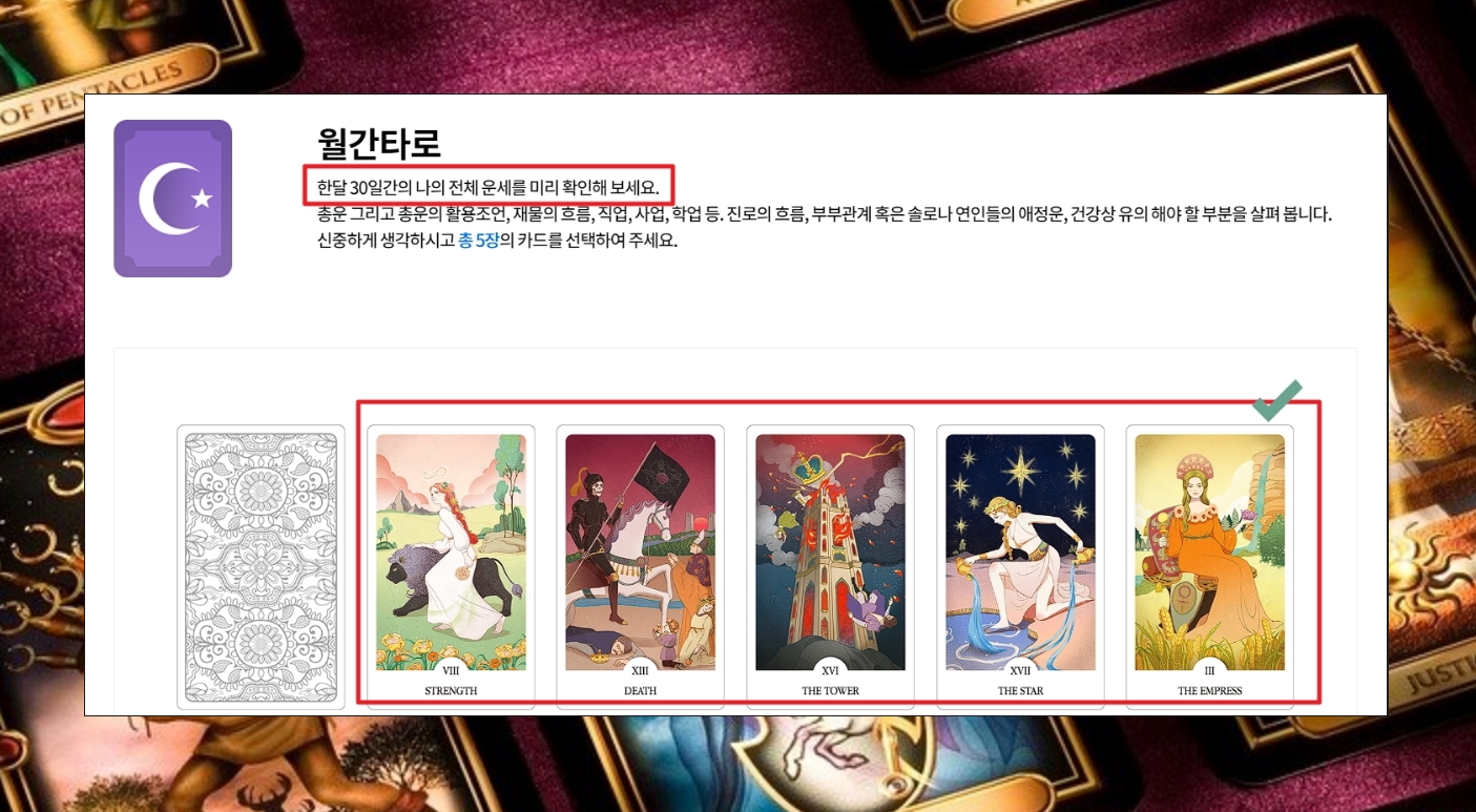 월간 운세를 볼 수 있는 것을 이용해 보겠습니다. 한달 30일간의 나의 전체 운을 미리 확인할 수 있다고 합니다. 무료로 한 달 총운은 물론이고, 재물의 흐름, 직업, 학업, 사업, 부부 관계, 연애운, 건강운 등에 대해 알아보기 가능해요. 이곳에서 점을 보는 방법은 매우 간단해요. 마음을 가다듬고, 집중을 한 상태에서 카드 뒷면을 5장 선택하면 됩니다.