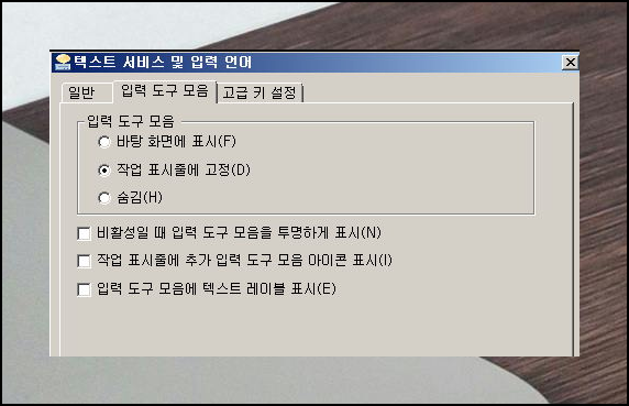 언어 추가가 끝나면 입력 도구 모음을 작업 표시줄에 항상 표시되도록 고정 설정해 주세요. 설정이 완료되면 화면 하단 작업표시줄에 'A' 또는 '가'라는 언어 표시 아이콘이 나타날 거예요. 이 아이콘을 마우스로 클릭하면 한글자판과 영어 입력 모드를 자유자재로 전환할 수 있습니다.